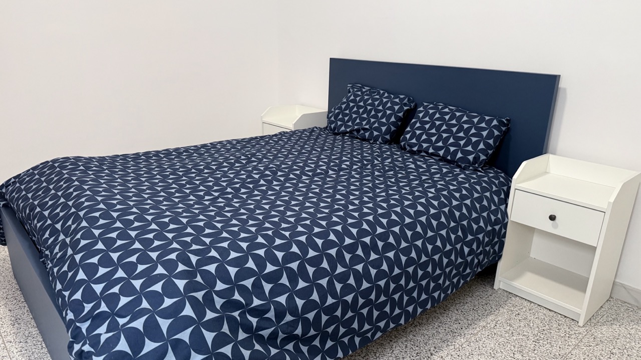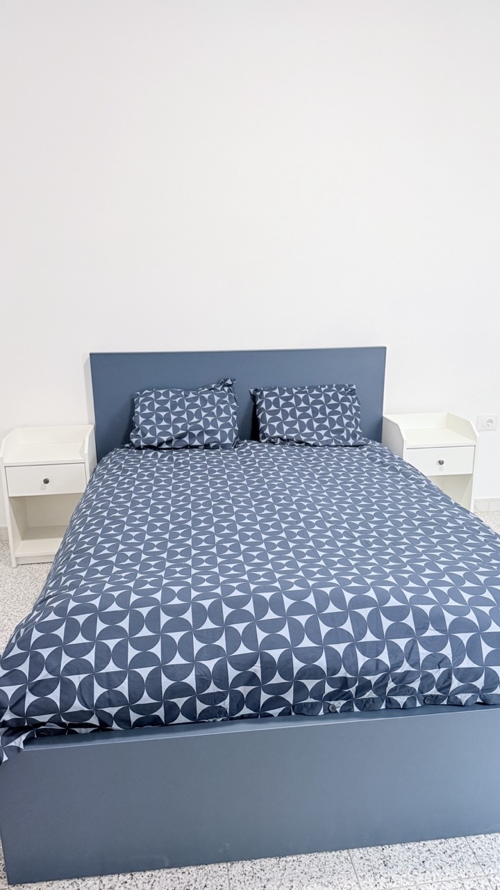 • Cama doble acogedora: Relájate en una cama con estilo, vestida con sábanas suaves y patrones geométricos llamativos que crean un ambiente moderno y acogedor.
