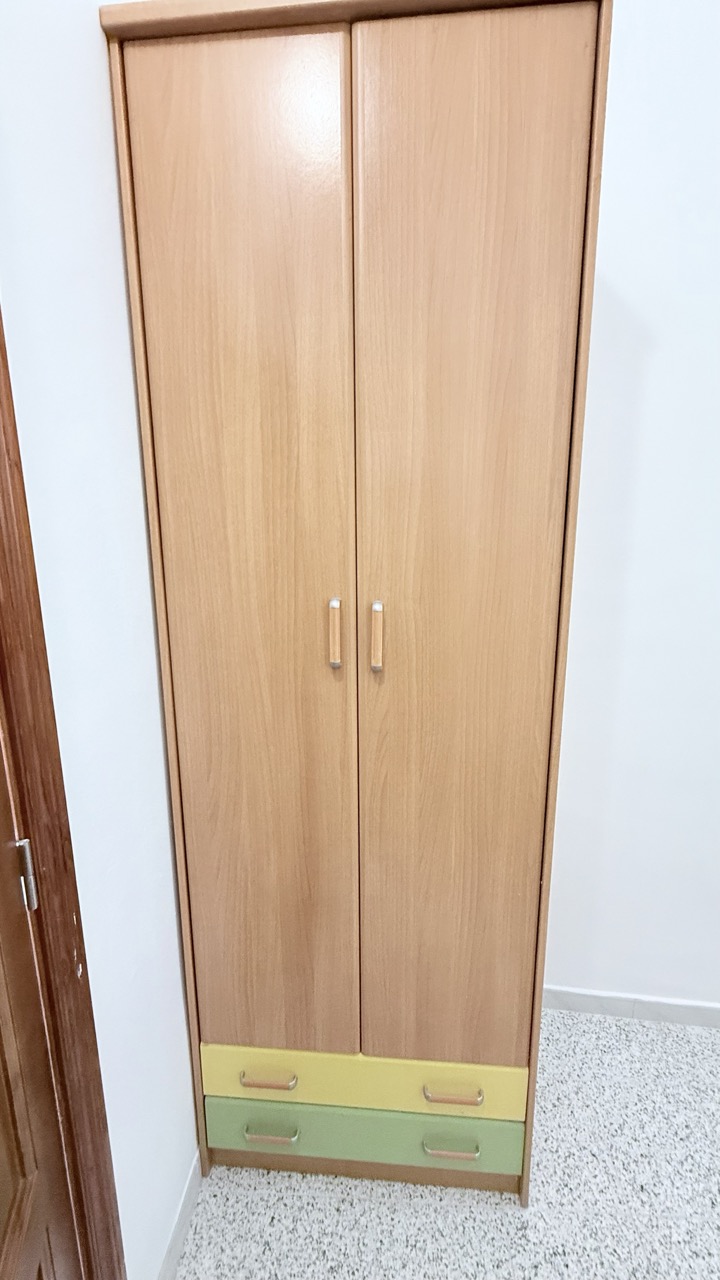 • Armario de madera: Un armario a juego con cajones inferiores adicionales para guardar tu ropa y objetos personales, manteniendo el espacio ordenado y organizado.