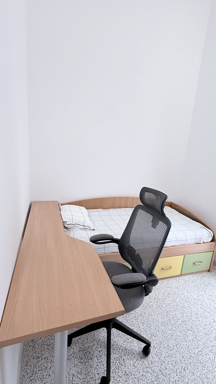 • Cama individual con almacenaje integrado: Una cama individual cómoda equipada con cajones de colores en la parte inferior, que ofrece confort y espacio de almacenamiento adicional.