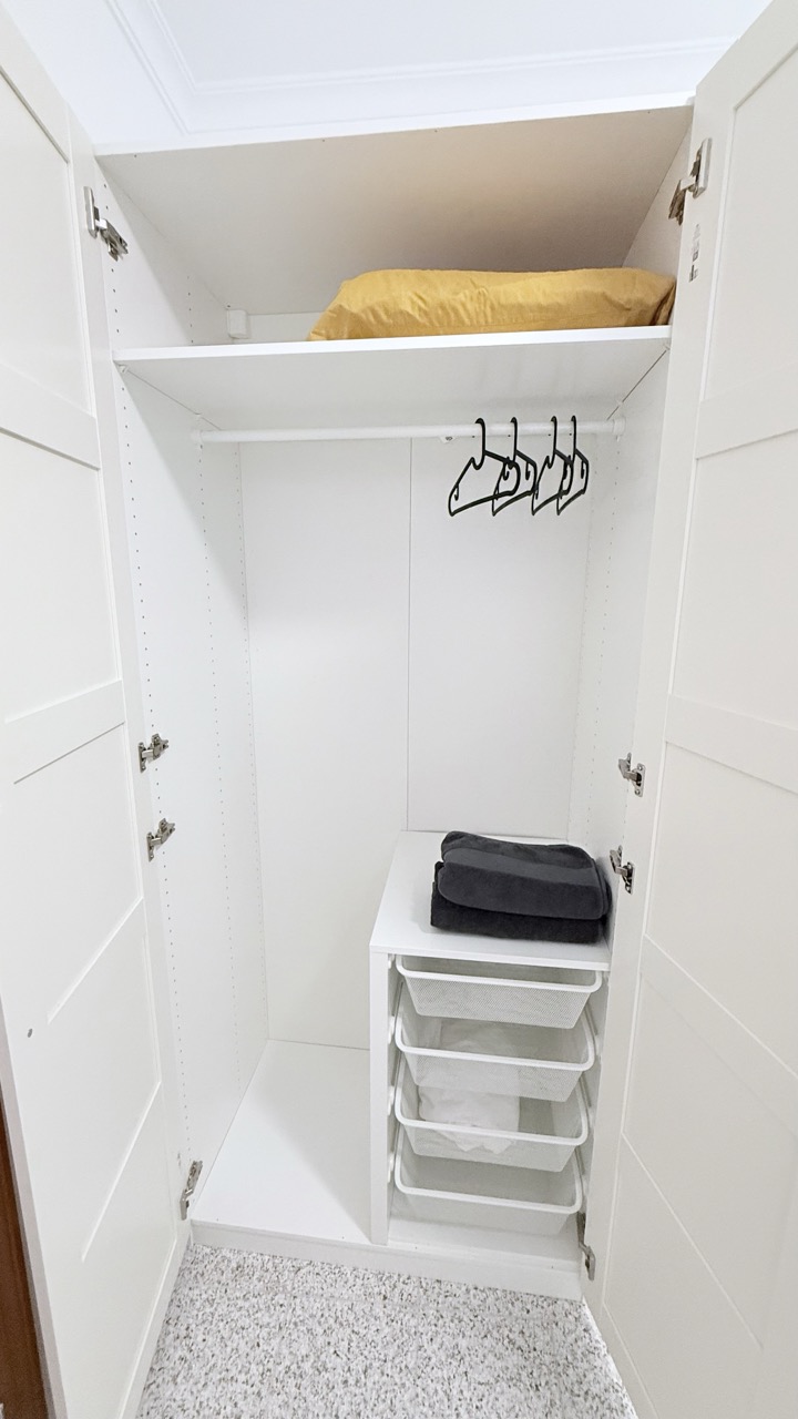 - Spacious wardrobe: A tall white wardrobe to store your clothes and essentials, keeping the room free of clutter.